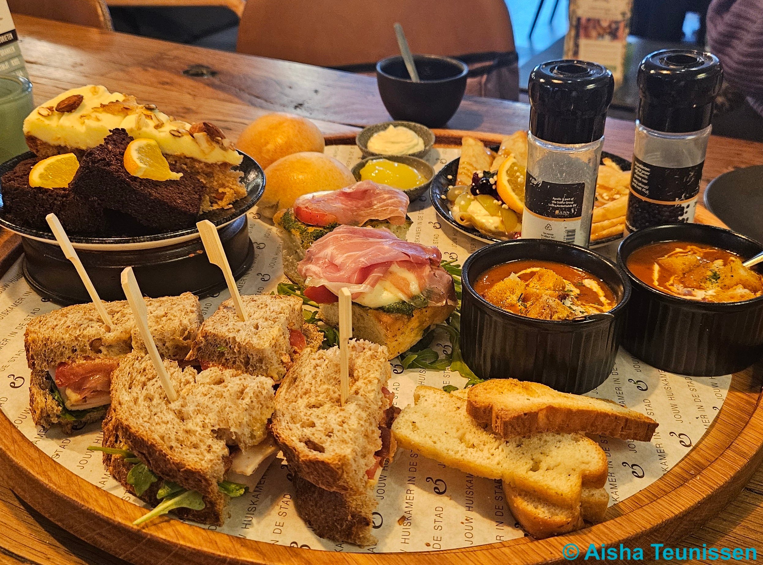 We kregen een soepje, verschillende broodjes, pannenkoekje, scones en gebak. Het was allemaal erg lekker en goed verzorgd.