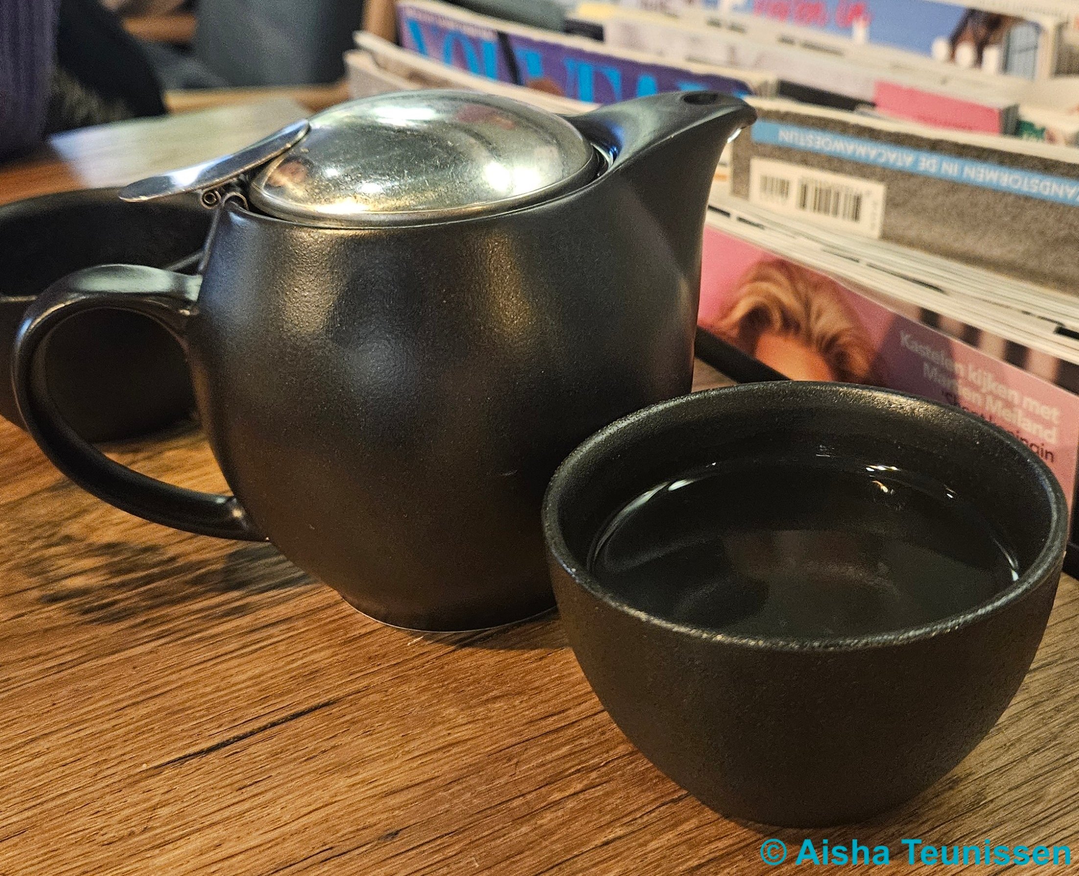 Ze hebben hier verschillende soorten thee die ze andere namen hebben gegeven. Alle theeën zijn biologisch. Zelf heb ik alleen de 'held in mok' en 'verse winterthee' geprobeerd. Beiden waren prima te drinken.