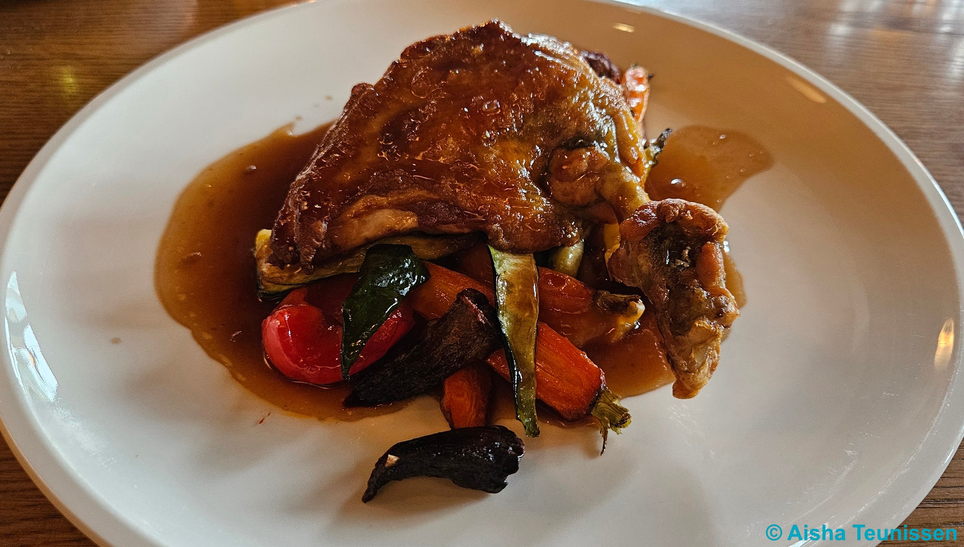 Tweede gang was parelhoenfilet met rode wijn jus. Geserveerd met veel groenten, die goede smaken hadden. Ik kan mij niet herinneren dat ik dit eerder gegeten heb. Ik vond het lekker, maar niet bijzonder genoeg dat ik het speciaal van een kaart zal bestellen.