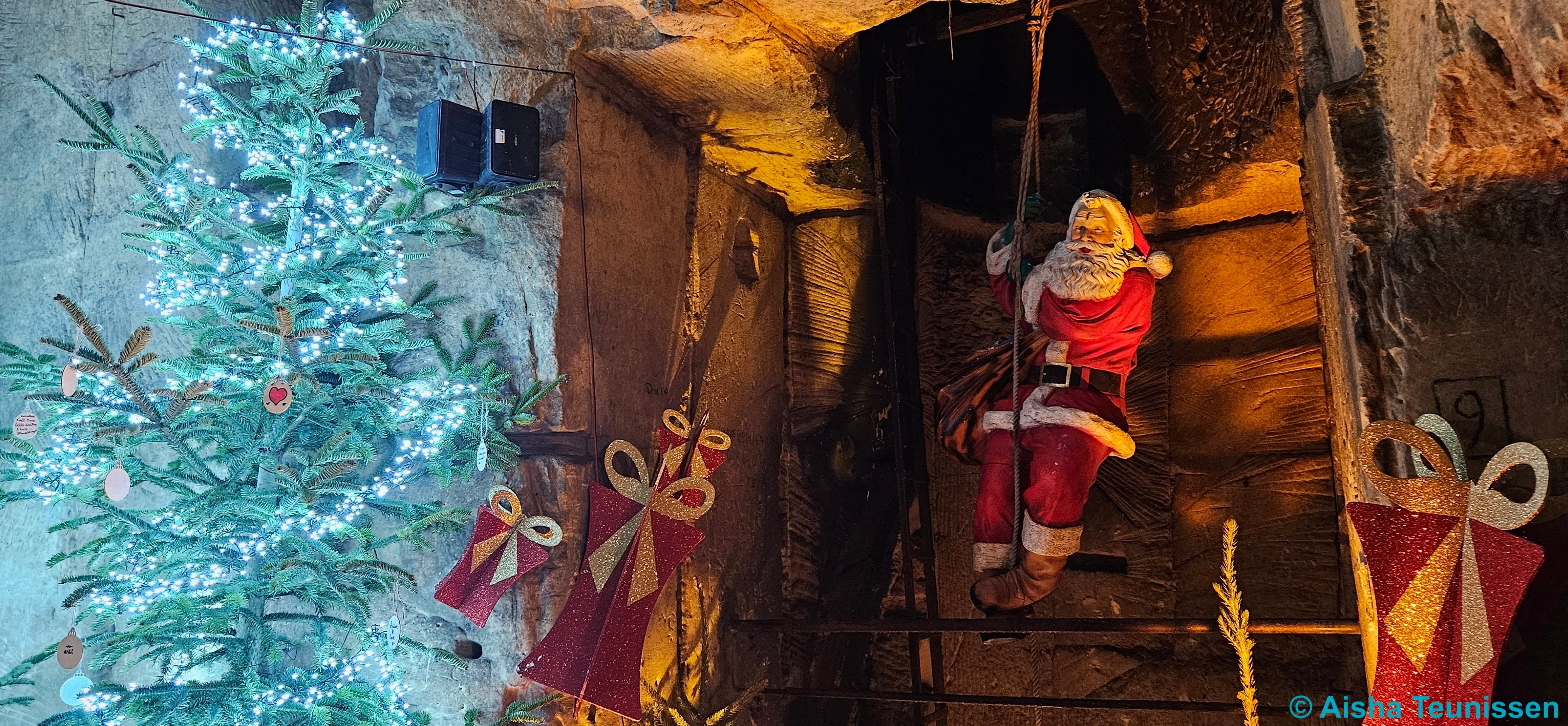 Decorated Christmas trees are scattered throughout the cave. Here and there, corners are made with dolls to create a cozy atmosphere. The route is marked with signs, but it's a one-way walkway. Along the way, you'll pass very old cave paintings. The items for sale range from typical Christmas items to homemade decorations.