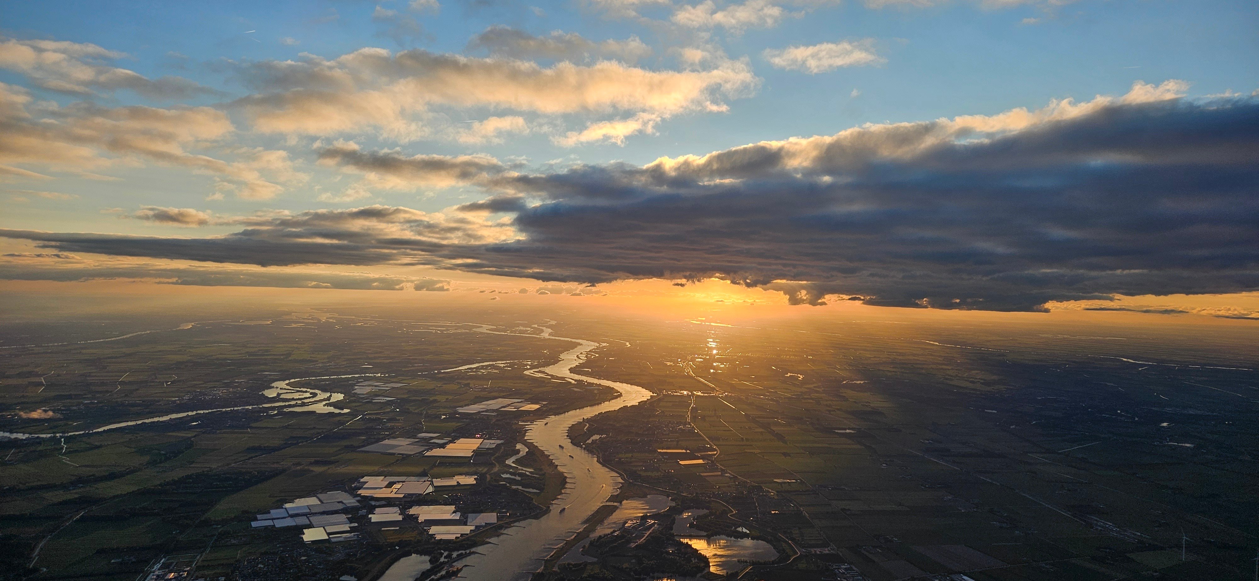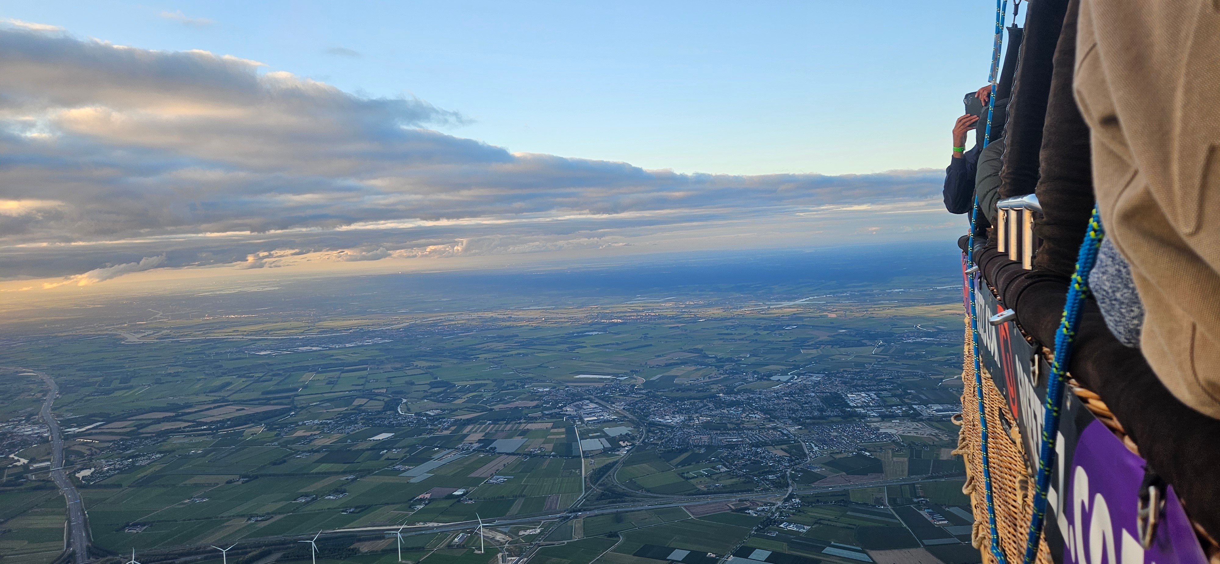 Ik raakte uiteraard niet uitgekeken. Het uitzicht was zo ontzettend mooi. De zon was af en toe achter de wolken en het volgende moment scheen hij juist weer fel. Hierdoor werd de omgeving ook elke keer weer net anders. Wel merkte ik op dat de mand zelf niet draait, waardoor je altijd hetzelfde uitzicht hebt. De ervaring van iedereen was daardoor compleet anders. Ik had het geluk dat ik aan de kant van de zon stond, waardoor ik de zonsondergang voor een groot deel heb mee kunnen maken. Aangezien je vrijwel altijd hetzelfde uitzicht hebt, werkt tijd ook net anders. Je hebt helemaal niet door hoelang je eigenlijk al vaart. Op een gegeven moment wordt gewoon door de piloot aangegeven dat wij een uur verder zijn. Dit is het moment dat de piloot gaat zoeken naar een landingsplek.