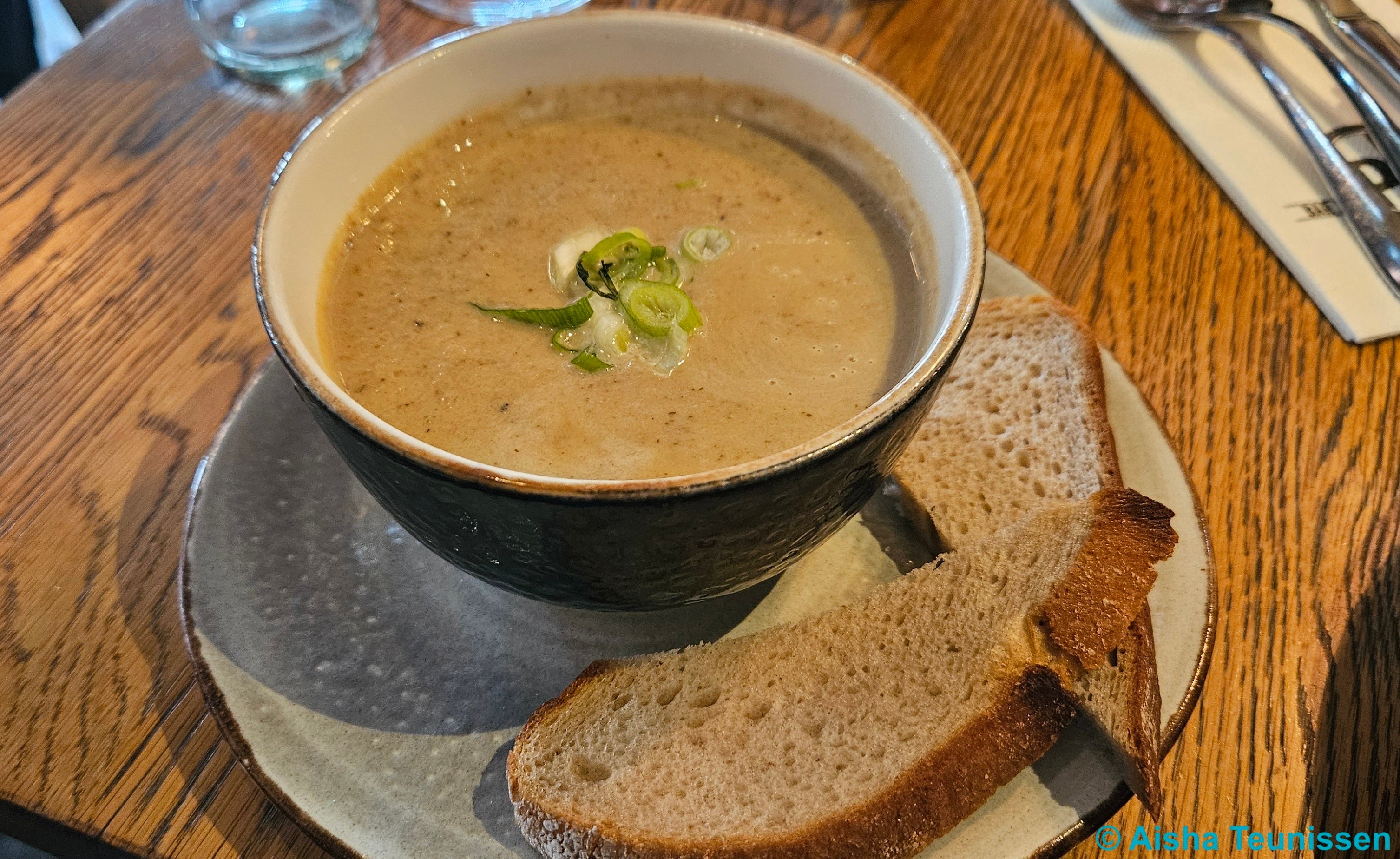 Ze hebben specialiteiten, waarbij er ook een soepoptie is. Op dit moment was het een paddenstoelensoep met truffel. Beide dingen vind ik erg lekker en dus besloot ik hier voor te gaan. Je kreeg bij de soep de optie om wit of bruin degenbrood te krijgen.