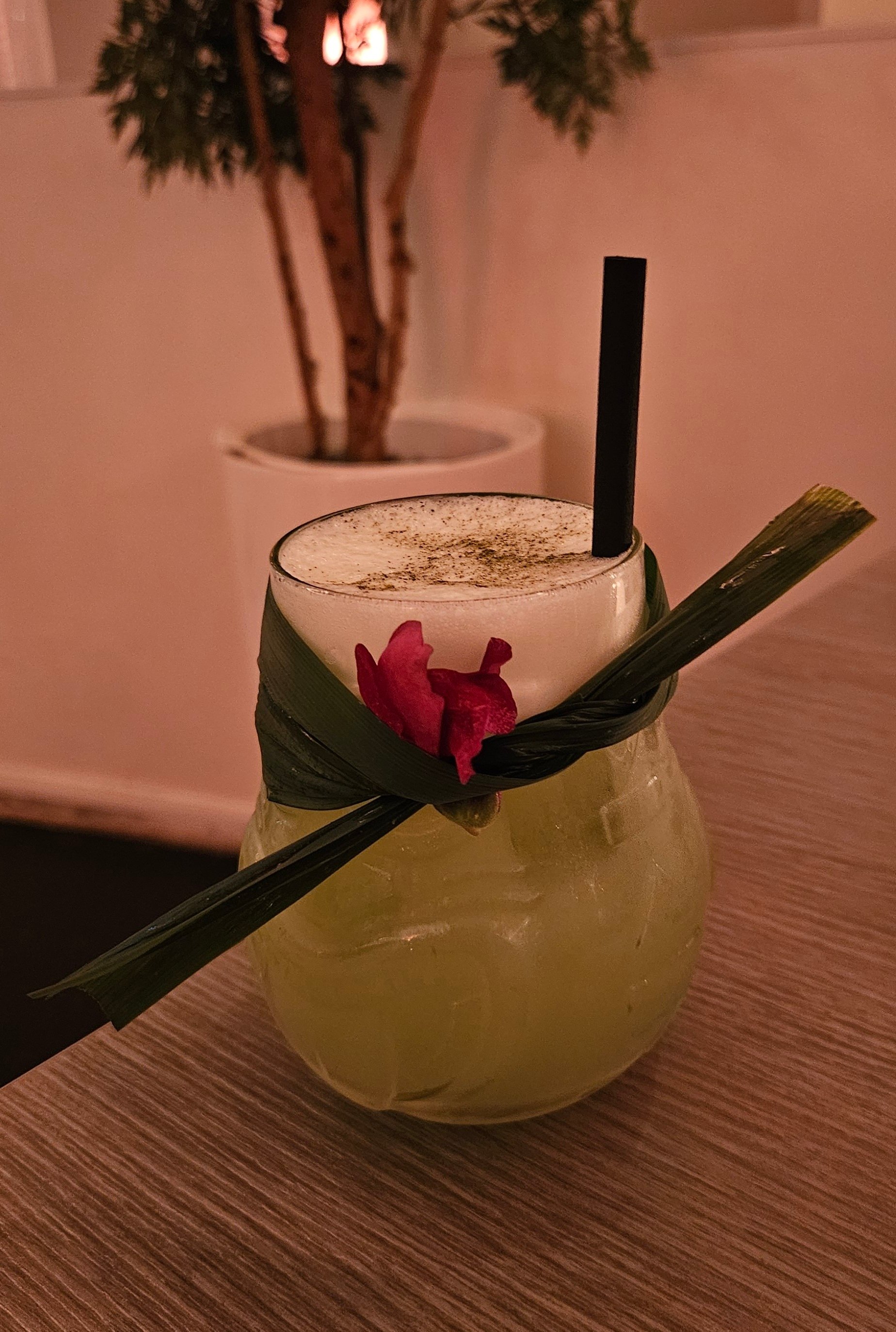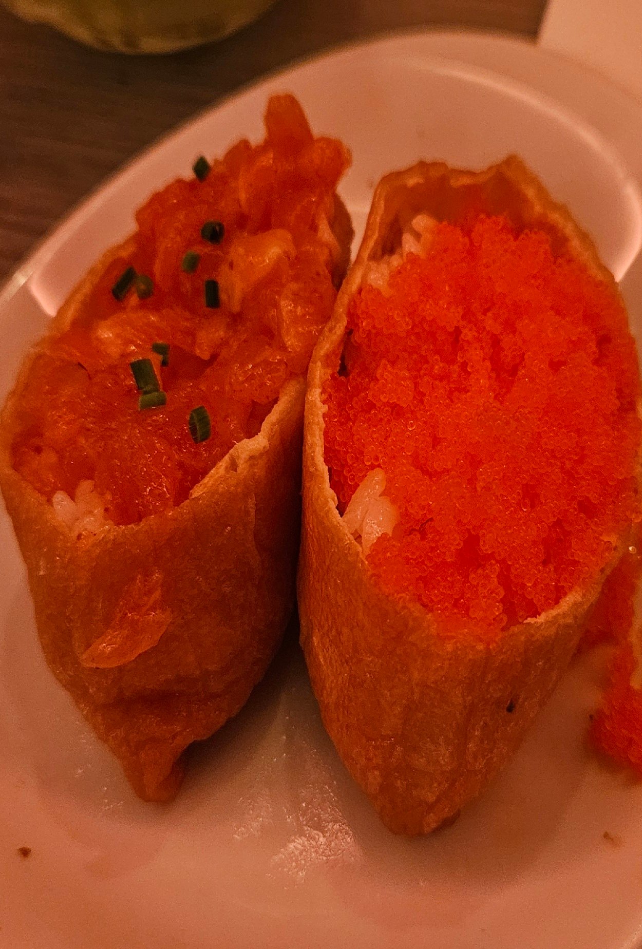 Ze hebben hier een uitgebreide lijst met cocktails, waaronder ook een aantal voor mij compleet nieuwe. Ik besluit de Pandan Sour te proberen, waarin een pandanlikeur van Bandoeng'22 wordt gemengd met citroensap, suikersiroop en eiwit. Ik vind het zelf fijn om gewoon de menukaart van bovenaan af te gaan en hierdoor begin ik vrijwel altijd met nigiri. Tijdens mijn eerste ronde valt de kwaliteit van het eten meteen op. De zeebaars was ontzettend lekker, maar ook de zalm en tonijn waren goed. Mijn tweede ronde bestond nog steeds uit nigiri, wel besloot ik compleet anderen te proberen. Bij mijn derde ronde ging ik over naar gunkan, mijn favoriete soort sushi. Naast de gebruikelijke variant met zeewier aan de buitenkant, hadden ze ook een variant met zoete omelet eromheen. De gunkan met zoete omelet is mij ontzettend goed bevallen en alle smaken die ik heb geprobeerd waren dan ook erg lekker. Bij de vierde ronde ging ik over naar tempura en ook hier was de kwaliteit goed te proeven. Daarna vond ik het tijd om hun warme gerechten te proberen. Hierdoor bestond mijn vijfde ronde uit champignons en vis. De champignons was een groot portie en de springrolls waren ook lekker. Als zesde en laatste ronde nam ik ijs, waarbij ik koos voor zwarte sesam en mango. Ook het ijs was erg lekker, de mangosorbet was erg verfrissend.