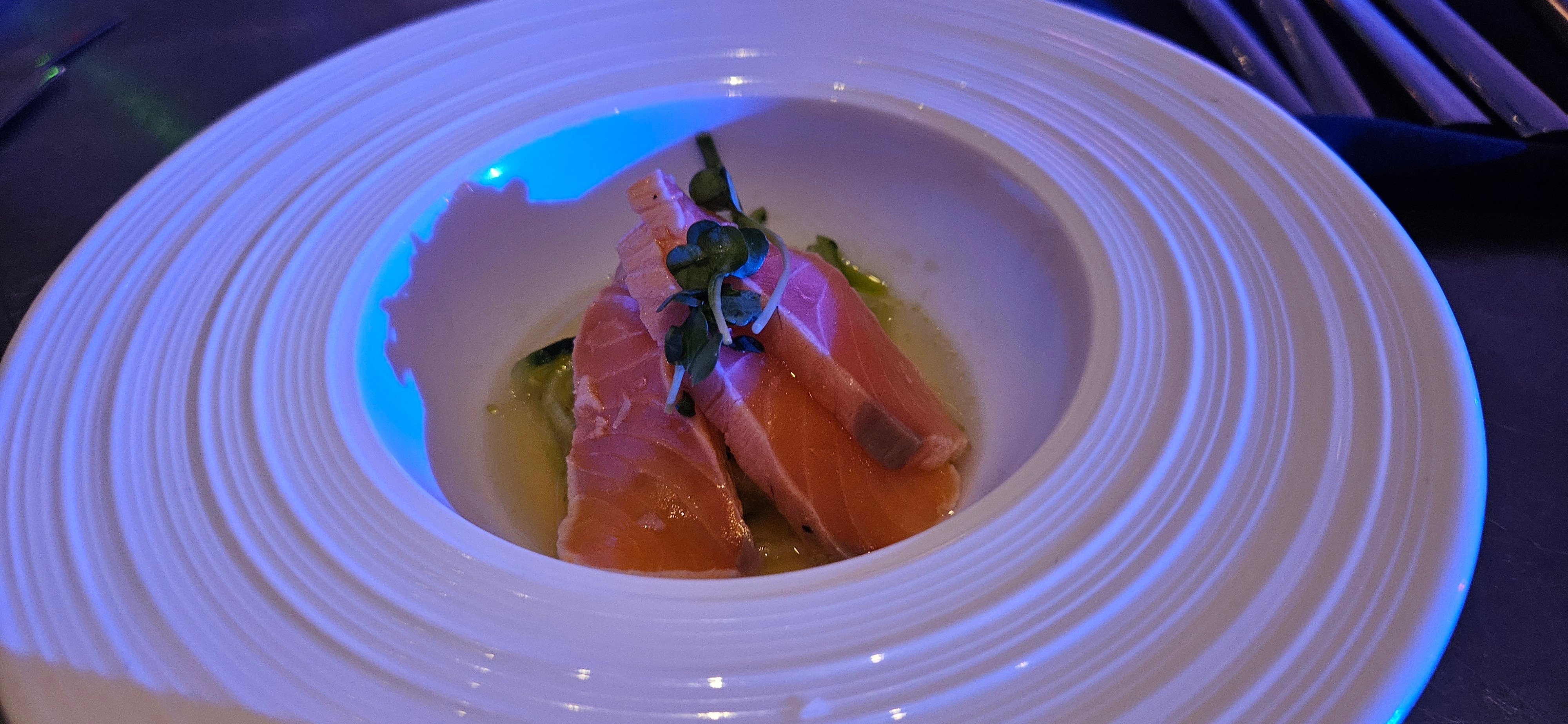 Als menu had ik de zalmfilet met frisse groenten, deze was ontzettend lekker en de zalm had een goede smaak. Als tweede gang koos ik voor het visgerechtje en dat was een Sint-Jakobsschelp, deze was ook lekker. Als hoofdgerecht had ik kabeljauwfillet. Als tussendoor had ik de scroppino, maar mocht ik ook het kaasplankje proberen. Het was lekker en veel verschillende soorten kaas. Ik kan het ook begrijpen als je deze ronde niet bijzonder genoeg vindt om mee te nemen. Tijdens een van de optredens kregen we een shotje. Als toetje had ik de Pornstar Cheesecake met witte chocolade en passievrucht. Het menu wordt elk seizoen veranderd.